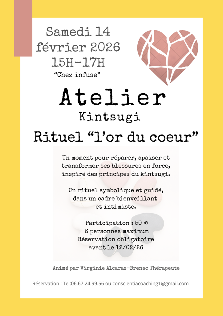 Atelier Kintsugi par 841 841 people viewed this event. 50 Samedi 14 février 2026 de 15h00 à 17h00Session organisée par Virginier Brenac, Thérapeute transgénérationnelle S’inscrire à l’évènement To register for this event email your details to conscientiacoaching1@gmail.com Inscrivez-vous via le webmail : Gmail / AOL / Yahoo / Outlook Date et heure 14-02-2026 | 15:00 à 14-02-2026 | 17:00 Date de clôture des inscriptions 12-02-2026 Lieu Infuse Partager avec des amis Facebook Twitter Linkedin Xing Pinterest